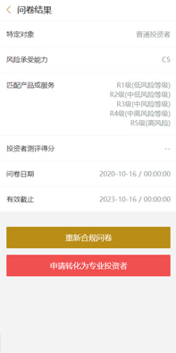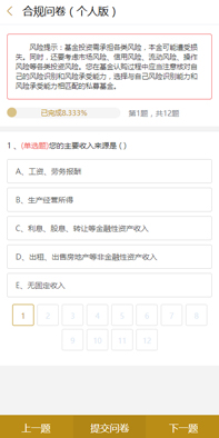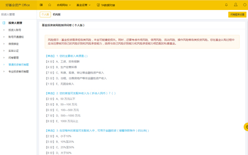 投資人C1~C5,與產(chǎn)品R1~R5在線適當(dāng)性管理、并通過(guò)留痕實(shí)現(xiàn)合規(guī),并支持自定合規(guī)問(wèn)卷內(nèi)容。