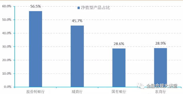 由圖可見,雖然股份制銀行的凈值化產品比重相對較高,但也只是剛剛到50%以上,而其他類型銀行凈值化產品占比極其少。