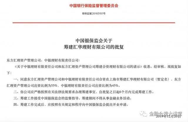 2019年12月20日中銀理財獲批與東方匯理資管合作,籌建匯華理財有限公司。這家中外合資理財公司稱為首家獲批籌建的有境外資管機構控股的理財公司。